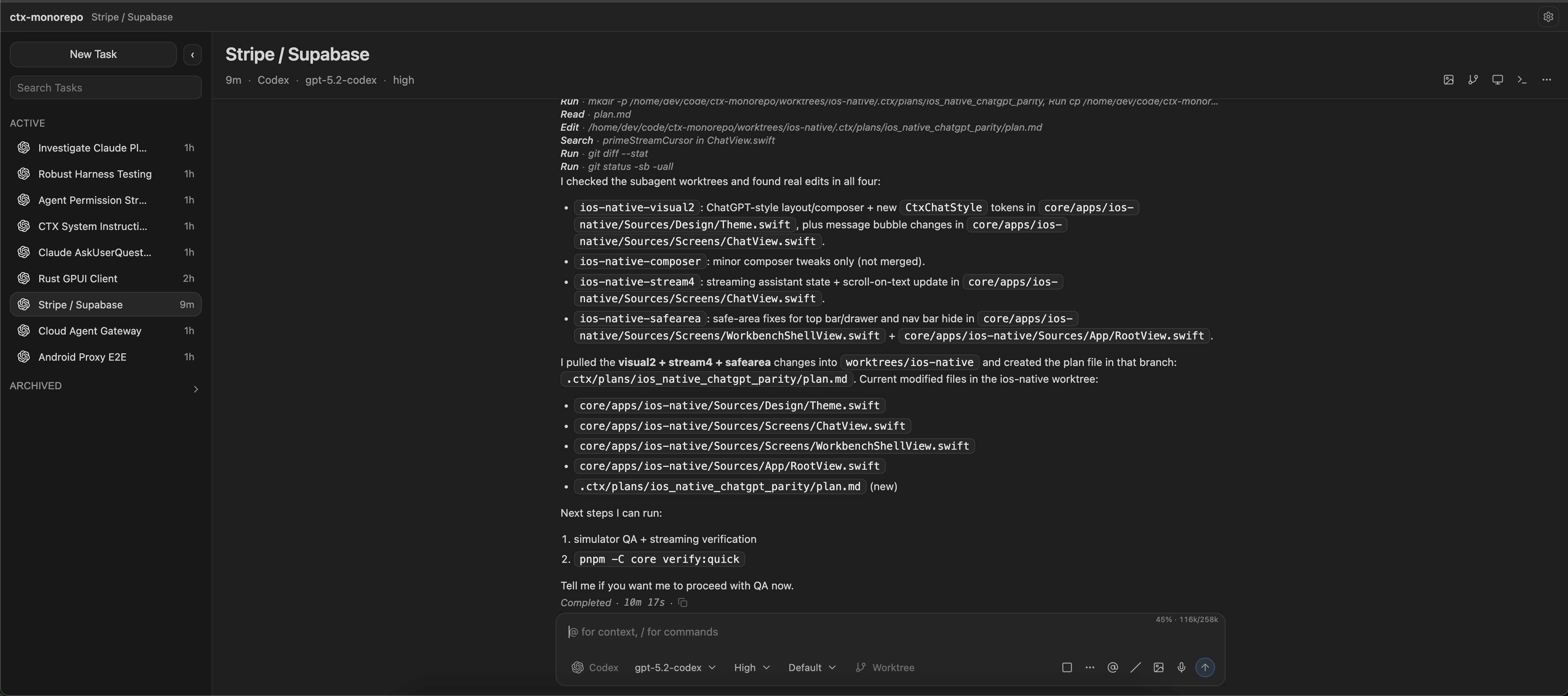 Task list: active and archived tasks.Session thread: agent and user messages.Composer: harness/model/mode controls and prompt input.Diff review: file-level change review and apply/reject flow.Artifacts: screenshots, reports, and other outputs attached to the task when needed.